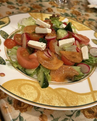 マンジャーレさんの今時期の季節のサラダはいちごが入っています!しかも少し前から柿も入ってきています。トマトやチーズもはいってほんと豪華なサラダです。これが850円でいただけるとは!みんな美味しいので驚いていました!