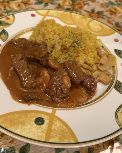 最近よくお願いするのがビーフストロガノフ!しっかりトリミングされたヒレ肉とマンジャーレさん特製のソースがほんとたまらない~!ごはんもついてくるのがうれしんです~!私がごはんよく食べるから多目に盛ってくださいました!