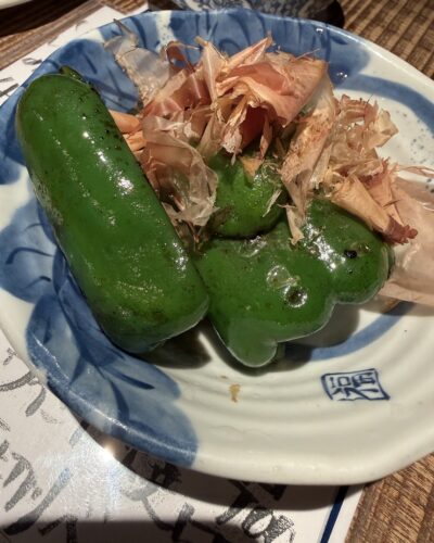 大好物の焼きピーマン!かつお節たっぷり!シャキシャキの食感とタレの風味がたまらないです~!生ビールがすすみますね~!