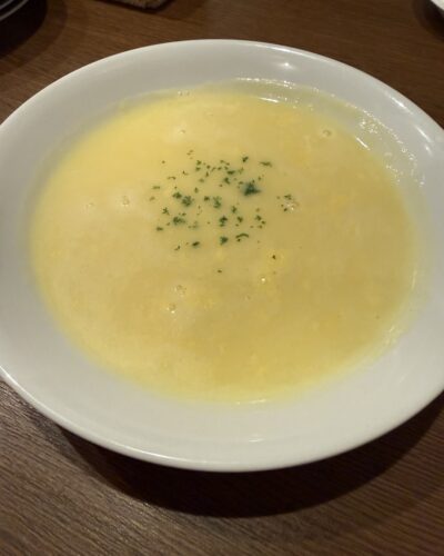 まずはコーンポタージュからいただきます!美味しいですね~!コーンポタージュ大好きなのですがアラスカさん以外でなかなかお目にかかれないです。