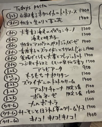今日のメニューはなんだろう?と思ってみてみると、ホタルイカのトマトソース、ホタテと生のりと菜の花のパスタ!どちらも捨てがたいですがこの日は生のりに惹かれました!