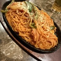 そこにまずは大盛のアラビアータが登場しました!大盛のボリュームに満足そうな笑みを浮かべていらっしゃいました。鷹の爪がしっかり入っていていい辛味だったようです。めちゃ美味しそう!