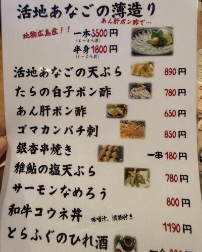 メニューをみてみるとアナゴのお刺身が!アナゴのお刺身って広島の名物といっても過言ではないと思いますが鮮度がよくないと出せないのでなかなか広島でもお目にかかれないんです。さすがカープ鳥さんですね!焼き鳥屋さんですがお魚もガチで取り組んでおられます。