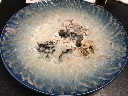 つづいてふぐのお刺身が登場しました!大きなお皿にふぐがたっぷりと!素晴らしいですね!これで何人前なのかな~と思っていると、、あれれ?お皿が次から次へと登場します。あれ?何かの間違い?と思ったら、、、
