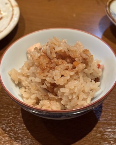ここで頼んでおいた鳥かまめしが登場しました!釜めしは30分くらいかかるので先に頼んでおいたほうがいいですよ~!いつもは釜が登場しますが今回は先にとりわけてもらいました!