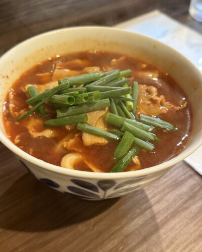 ということでピリ辛にしてもらいました!いただいてみるとほんとめちゃくちゃ美味しい~!ほんのりピリ辛で、広島菜が入っていまして食感もいい~!あさりもめちゃうまです!