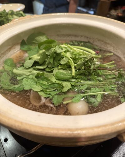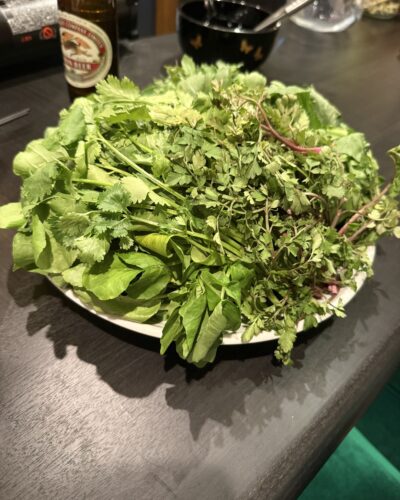 お肉をいただいたらお野菜もいれていきます。野菜もしゃぶしゃぶくらいで大丈夫とのことでいただいてみるとめちゃくちゃ美味しい~!パクチーをお鍋でいただくのも初めてですが美味しい~!