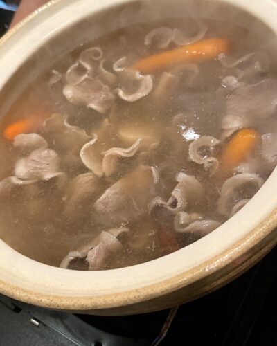 お鍋がぐつぐつきたらイノシシ肉をしゃぶしゃぶしていきます。お出汁は野菜、昆布、牡蠣でとってあるそうです。めちゃくちゃいい香りがするんですよ~!マスターのお父さんが作られている大きな原木しいたけも入っていました!