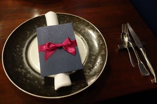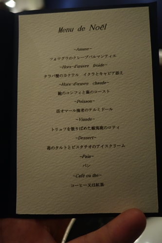 テーブルについてグラスのシャンパンをお願いして今回のクリスマスディナーメニューを確認してみると、、おおおオマール海老が!さらに活と書いてあります!すごい!