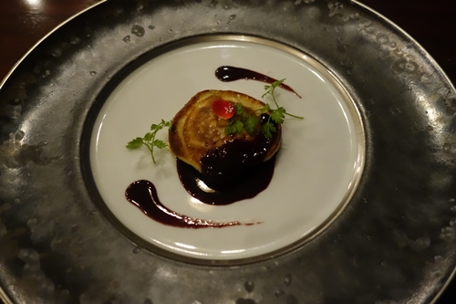 最初のお料理はフォアグラのクレープパルマンティエ!どんなお料理なのかな~と思いながら待っていると、いい香りが!パンケーキのような生地の下にフォアグラが隠れていました~!いい香りですね~!ナイフで切り分けていただいてみると、、、お、お、おいしい~!ほっぺがおちるとはこのことですね~!
