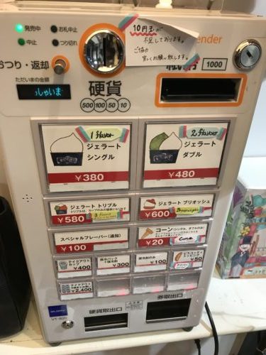 階段を上がって見るとありました!入ってすぐの券売機でチケットを購入します!この日は3人だったのでシングルを2つで一つコーンにしてもらいました!