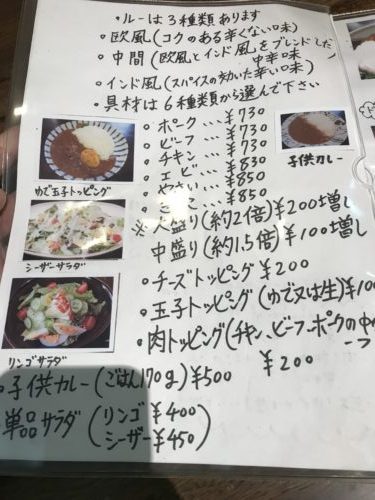 この日は珍しく夕方にうかがいました!ちょっとお昼に伺う時間がなかったので。お店にはいってメニューをみながら何にしようかな~と。いままではインド風のスパイスがきいて辛口のカレーをいつも頼んでいたのですが、この日は少しマイルドに中間にしました~。以前同級生と食べに行った際に同級生が食べていた中間がとってもおいしかったので!