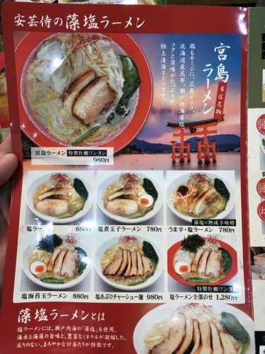 まずは生ビールで乾杯してメニューをみてみるといろいろな種類がありました。藻塩で作るラーメンなんですね~!これは珍しいですね~!宮島ラーメンとお店の名前にあるので私は宮島ラーメンをお願いしました。友人は塩ラーメン全部乗せを頼んでいました。