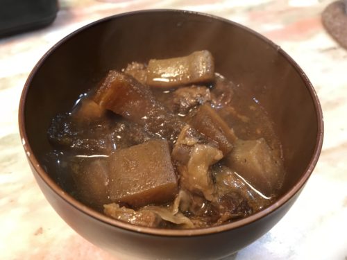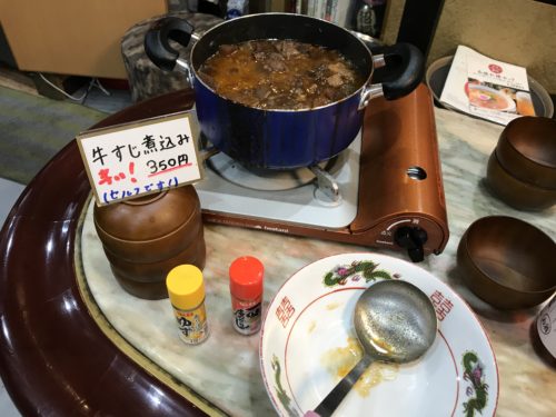 「牛すじ煮込みありますよ~!セルフなんですが、目いっぱいいれてもらって結構ですよ~!」