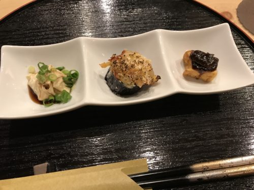 まずは生ビールで乾杯させていただいて先付からいただきます!湯葉、茄子グラタン、厚揚げ田楽でした~!めちゃおいしいです~!