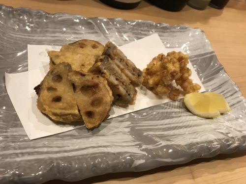 レンコンのはさみ揚げをお願いしました~!おまけにとうもろこしもつけてくださいました~!抹茶塩でいただきました~!熱々で超おいしい~!たまりませんね~!