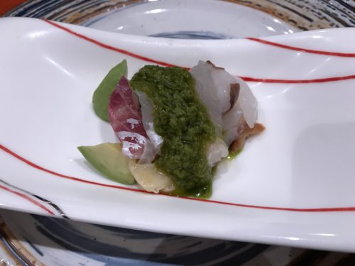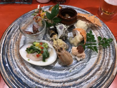 最初のお料理に早くもびっくり!うちわ海老、ハマグリ、シャコ、さざえ、ホタルイカ、そのほかいろいろ!どれもとってもおいしい~!ソースも色々な種類が味わえて最高でした!