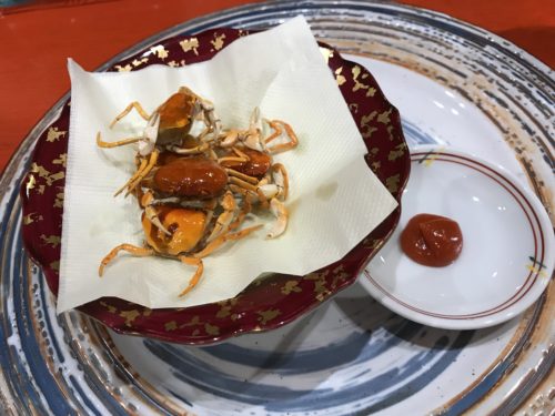 かわいい沢蟹には少し辛いソースをつけていただきます。かわいいので食べるのに躊躇しちゃいますが、食感最高ですよ~!