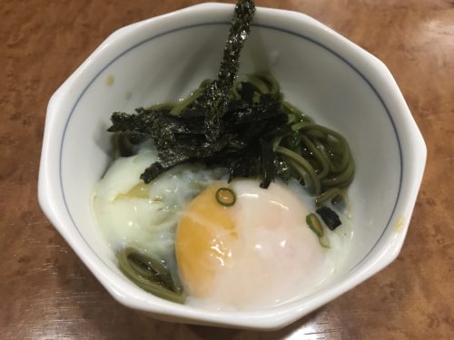 つきだしは茶そばを選びました。温泉卵も入っていて混ぜていただきました。出汁もおいしい~!