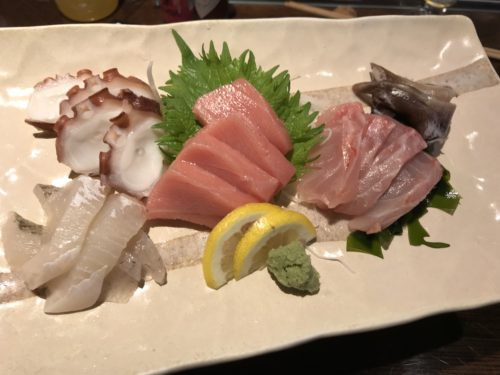 お刺身を盛り合わせで!キンメダイ、甘手カレイ、タコ、まぐろ、とり貝!どれも一級品です!超おいしいです~!醤油をつけなくても甘くておいしい!