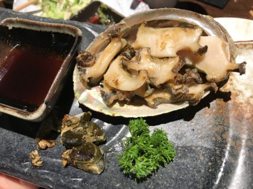 アワビが一つだけあると聞いたので焼いてもらいました。活かしなのでめちゃめちゃおいしいですね~!バターたっぷりでうれしい!