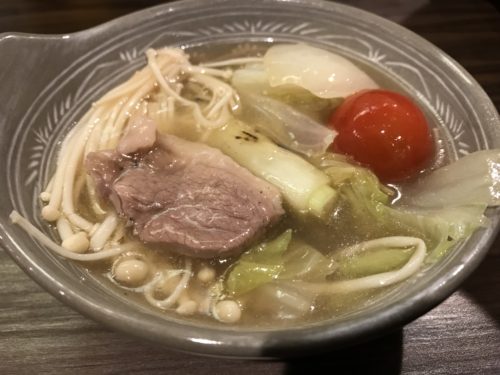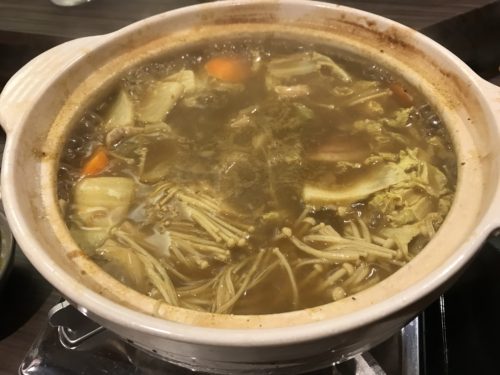 お店に到着してまずは生ビールで乾杯です!目の前にはコンロがセットされていました。しばらくするとおいしそうなお鍋が!野菜もたっぷり入っています!そしてまさかのトマトまで!トマトってお鍋に入れたら食欲が増しますよね~!いただくとあ~おいしい~!少しとろみがついていたのでどうしてか聞くと、