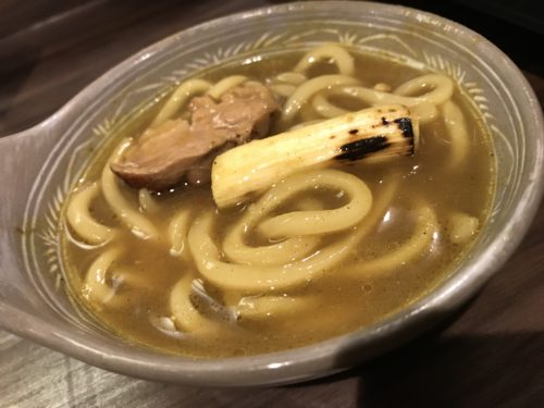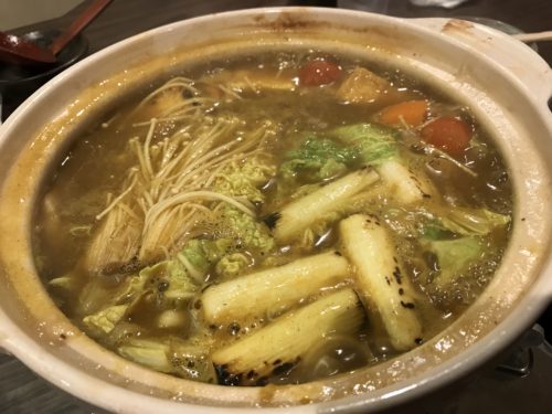 お酒をいただきながらしばらくするとお店の中にカレーのいい香りが。とってもおいしそうなカレー鍋が登場しました!鴨肉もたっぷり入っています!いただいてみると、超おいしい~!たまりません!あっという間に食べきってしまいました!