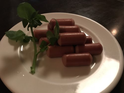 そしてもう一つがウィンナー!缶詰のウィンナーです。缶詰のウィンナーなんて日ごろ全く食べる機会がないのですが、これがおいしいんですよね~!おそらくですが燻製のように仕込んであるんだと思います。香りがいいですね!なのでとってもウィスキーにあうんですよ~!