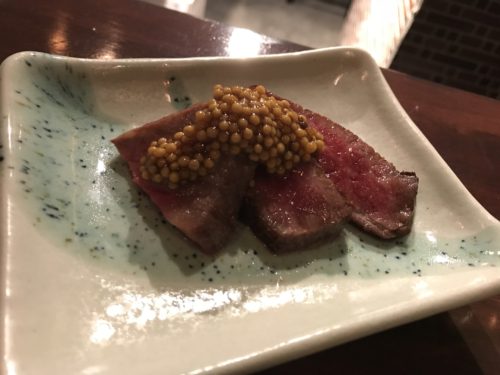 イチボの部分を粒マスタードでいただきます!粒マスタードもなかなか珍しいですよね~!脂の入り方がちょうどよくて最高においしい~!知人の方もとっても喜んでくださいました。