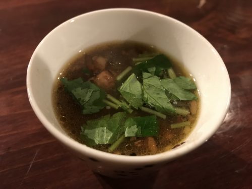 まずは生ビールで乾杯させていただいてつきだしのキュウリとネギをいただきます。これ、めちゃおいしいです。