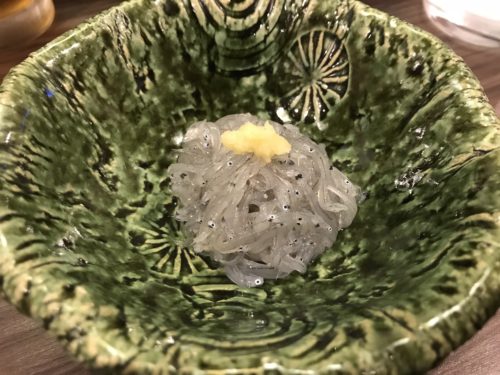 一品料理をいくつかお願いしました。最初に登場したのがなんと生しらす!生シラスはなかなかいただくことができませんよ~!鮮度が命ですからね~!今年初めての生シラスでした!透き通った生シラスおいしそう!そもそも生シラスに自然の塩味がついているのでしょうがと一緒にそのままいただきます。おいしい~!旬をいただくって幸せですね~!どこが産地かうかがってみると広島県は倉橋産でした!やっぱり倉橋なんですね~!