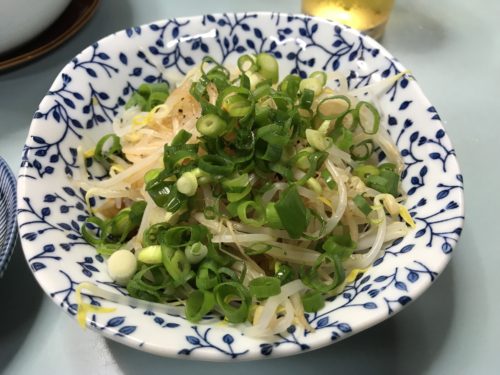 まずはキリンの瓶ビールで乾杯してお母さんに餃子を焼いていただきます。この日は8名で訪れたのでたくさん食べますよ~!まずはもやしからいただきます。一気に全部たべようとしたらだめですよ~。餃子と一緒に食べるものも残しておかないと。
