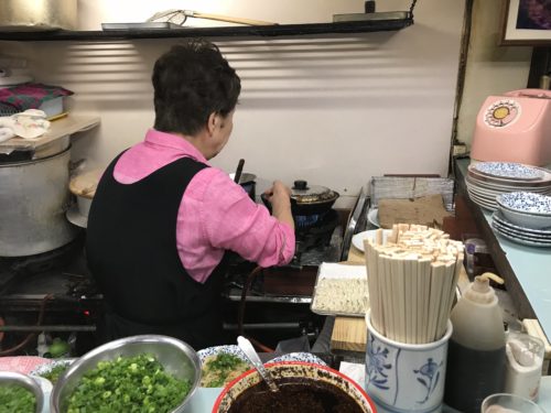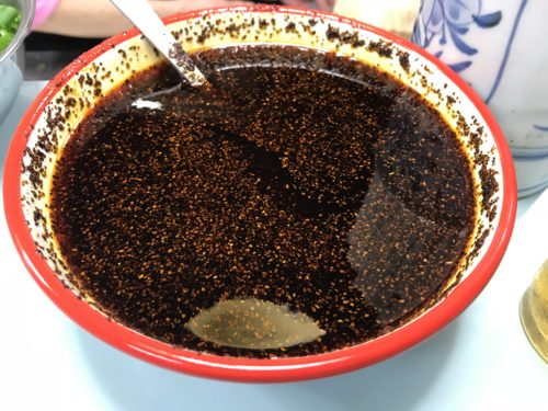 タレには特製のラー油をいれていただきます。なれるまではお母さんにお願いすると適量を上手にいれてくださいます。私はもう慣れているので自分でいれてしまいます。