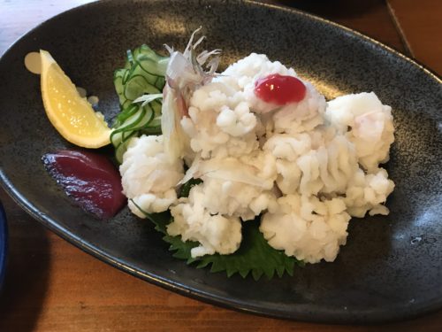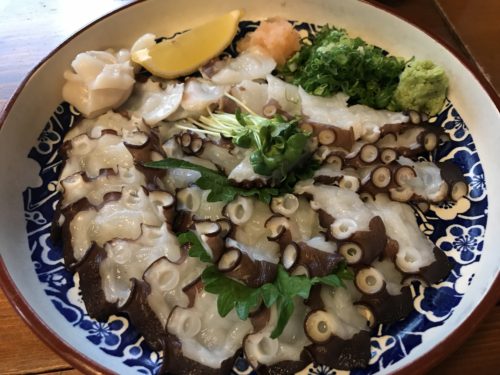 感心しているとさらに次の波が!なんと生タコのお刺身が!どっちがメインなのかわからないくらいおいしい~!柔らかくてほどよい歯ごたえがたまりません!ポン酢でいただくとなお一層おいしい~!