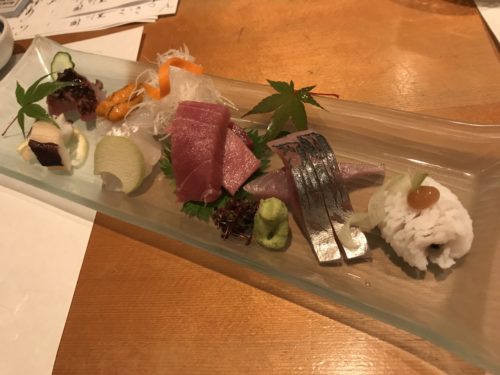 お刺身を盛り合わせていただきました。生まぐろ、鱧、イサキ炙り、地鯵、イカ、ウニ、カレイ!すばらしい盛りになっています。あ~、、ため息がでるくらいおいしい。特に旬になっているイサキがおいしい!マグロも本物です!こんなにおいしいお店だったのか、、、もっと早くくればよかった、、、