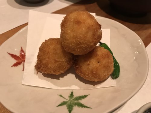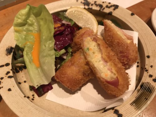 さて、先日ご紹介いたしました魚菜黒田さんでおいしいお魚をいただいた後もどんどんおいしいお料理をいただきました!続いては気になったポテトサラダのハムカツをお願いしました。ポテトサラダでハムカツ?さらにこういう割烹のお店のハムカツフライってどんなんだろうと思いながら待っていると、なるほど!ポテトサラダをハムで挟んで揚げていました!見るからにおいしい!サクッという食感とともにポテトサラダの塩気が口の中に広がってめちゃめちゃおいしい~!聞くと人気メニューなんだそうです!これは外せませんね!