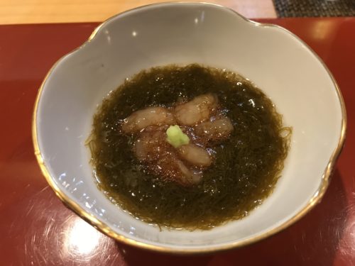 さて、おいしいお鮨を食べたくなっていつもの鮨あらたさんに伺ってきました。いつもならいろいろなお料理をいただいてから握ってもらうのですがこの日は握りメインにしてもらいました。まずは瓶ビールをいただきながら、先付の甘えび入りのもずく酢をいただきました。とってもおいしい~!