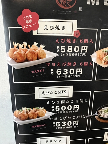 とにもかくにも食べてみないと話は始まらないということで、お店に入ってみました!すると店内で食べることができるスペースもありました!メニューをみてみると、普通のたこ焼きもあるようでした!えび焼きと一緒にたこ焼きとのセットもお願いしてみました!