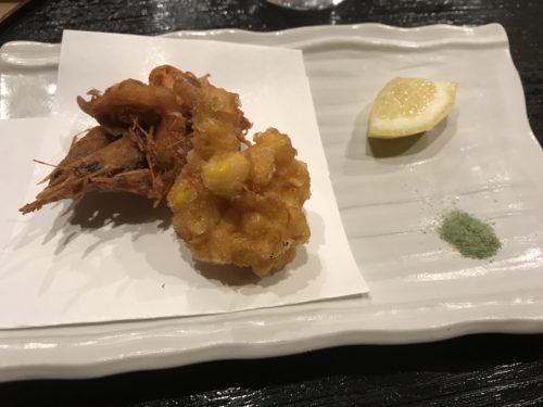 天ぷらはとうもろこしと海老でした!衣もとってもおいしいです~!お塩でいただきましたがあっさりといただけましたよ~!