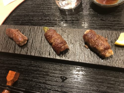 ここで牛肉が!大根おろしやアスパラなど違うものを巻いてくださっていました。めちゃおいしい~!たまりません!