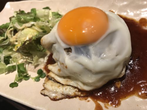 外してはいけないのがハンバーグ!これがまた超おいしい~!半熟卵がこれまたうまい!牛肉がぎっしりつまっているのでジューシーです!