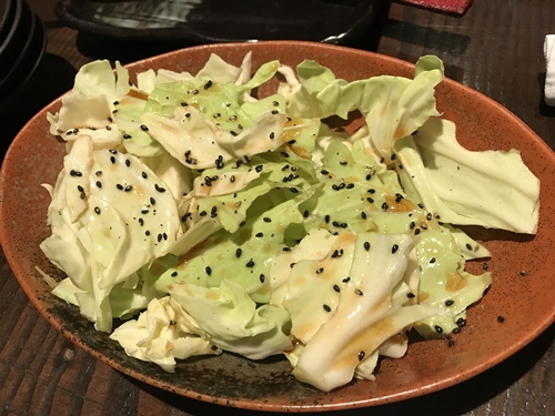 まずは生ビールをいただきながらキャベツをいただきます。ポン酢がかかっていてとってもおいしい~!結構食べちゃいました!