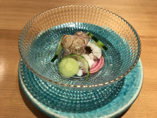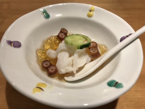 タコが登場しました!土佐酢のジュレと一緒にいただくのであっさりとそして涼を感じながらいただきました。器もとってもいいですね~!