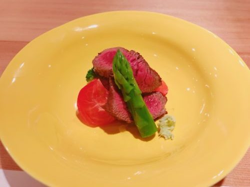 ここで和牛のヒレ肉が登場しました!こういう赤身のお肉がこの年齢になってくるとたまらなく好みになってきます。添えてあるアスパラガスがこれまたおいしい~!めちゃめちゃおいしいです~!