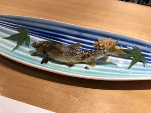 大将が鮎を出してくださいます。鮎の串打ちを行って大き目のトレーにのせて塩をふってくださいます。こういうライブ感覚でお料理を目で楽しめるのもうれしいですよね。なかなか目で楽しませてくださるお店も少ないですからね~。