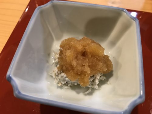 瓶ビールで乾杯して先付のしらすをいただきました。おいしい~!