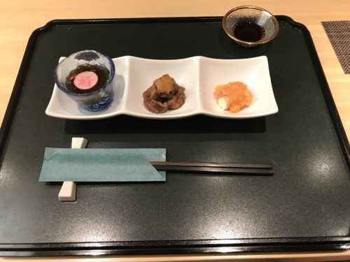 先付は砂ずりの醤油漬け、もずく、そしてハムチーズ!このにんじんとたまねぎの特製薬味がたまらないんです!めちゃめちゃおいしい~!