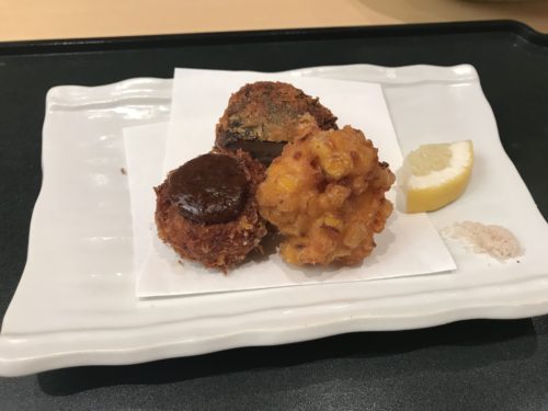 とうもろこしのかき揚げ、しいたけ、コロッケの揚げ物のご一行様が到着されました!しいたけも大きくておいしい~!とうもろこし最高ですよ~!あ~幸せです!