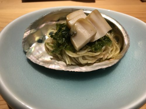 冷製スパゲティの上には、、まさかのあわび!そしてあおさ!あおさ大好物なんです!こちらもめちゃめちゃおいしい!最高!もちろん一緒に日本酒をいただきます!毎日3種類の日本酒を用意されているそうです!