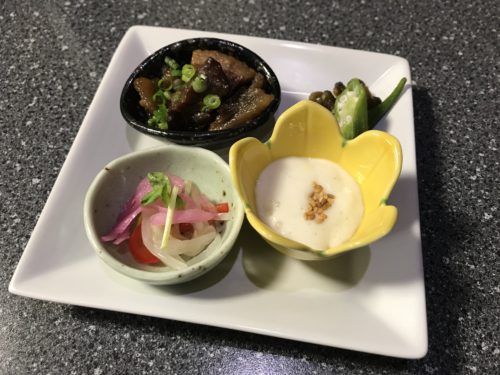 まずは瓶ビールで乾杯させていただいて先付が登場しました!自然薯、イノシシ肉、おくら、酢漬け、なすと盛りだくさん!とってもおいしい~!